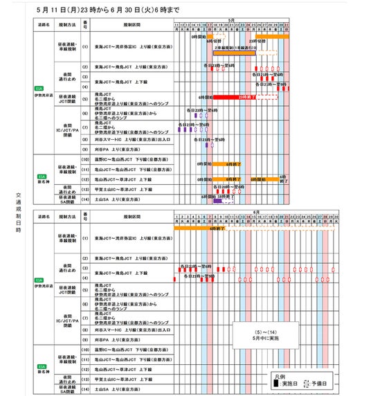 NEXCO中日本 名古屋支社(名古屋市中区、支社長・前川 利聡)とNEXCO西日本 関西支社(大阪府茨木市、支社長・諸富 正和)は、安全を何よりも優先し、安心で快適に高速道路をご利用いただくため、5月11日(月)23時から6月30日(火)6時までの間、E1A伊勢湾岸自動車道(伊勢湾岸道)刈谷スマートインターチェンジ(IC)~湾岸弥富IC(上下線)およびE1A新名神高速道路(新名神)菰野IC~草津ジャンクション(JCT)(上下線)、亀山JCT~亀山西JCT(下り線)で集中工事(昼夜連続・車線規制、夜間通行止め、昼夜連続JCT/SA閉鎖、夜間IC/JCT/PA閉鎖)を実施します。