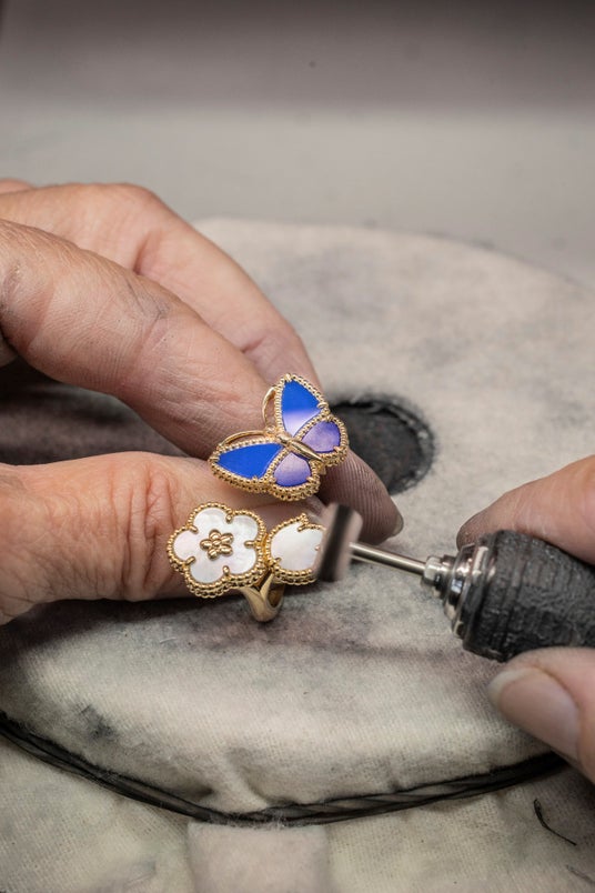 ラッキー スプリング コレクションは、これまでローズゴールドの作品で構成されていましたが、今回加わるロングネックレス、5モチーフ ブレスレット、クリップ、アントレ レ ドア リング、イヤリングの5つの新作にはイエローゴールドが採用されています。ロングネックレスに新たにあしらわれたのは、3匹の蝶の姿です。側面と正面からの姿が交互に表現され、チェーンに沿って軽やかに舞っているかのような生命感を宿すと同時に、非対称の美を生み出しています。蝶の体と触角はポリッシュ仕上げのゴールドで造形され、細部におよぶメゾンのこだわりを物語っています。この作品は伝統的なロストワックス鋳造で制作され、その後に宝飾職人の手作業による調整と研磨が施されます。一つひとつの作品は、制作工程の各段階において、表と裏の両面に加えビーズで二重に縁取られた輪郭にまで研磨がなされ、ゴールドの輝きが最大限まで引き出されます。