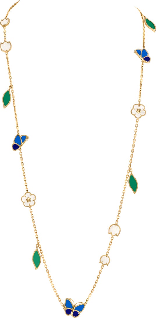 ラッキー スプリング パピヨン ロングネックレス、15モチーフ(イエローゴールド、ラピスラズリ、ブルーアゲート、グリーンアゲート、ホワイト マザーオブパール)
