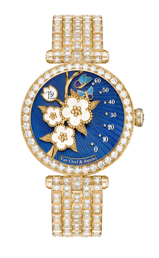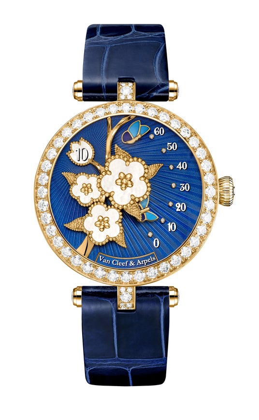 レディ ラッキー スプリング パピヨン ウォッチには、ホワイト マザーオブパールのプラムの花が3輪あしらわれています。それぞれの花は高さを変えて緻密に配置され、ボリューム感と奥行きを生み出しています。各モチーフを美しく飾るのが、さまざまな技巧を駆使したイエローゴールドです。ゴールドビーズが花々を縁取り、ポリッシュ仕上げの枝とテクスチャード加工を施した葉が添えられています。一方、ビーズで縁取られた、スズランを模した窓からは、ホワイト マザーオブパールのディスクが姿を現し、時を伝えます。この優美なブーケは、ギヨシェ ホワイト マザーオブパールに深いブルーのペイントを施した文字盤を背景に、鮮やかに浮かび上がります。文字盤に刻まれた放射状のラインによって光が自在に巡り、この有機的な素材の輝きを一層際立たせています。