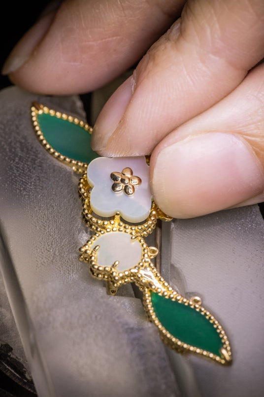 卓越性を追求するヴァン クリーフ&アーペルの伝統を受け継ぎ、蝶と植物のモチーフには厳選された素材があしらわれています。ラッキー スプリングの新作では、蝶の前ばねにブルーアゲートを、葉にグリーンアゲートを使用しています。メゾンは、ブルーとグリーンのいずれにおいても、淡い色調から濃い色調まで最も均一でバランスの取れた色彩をもつ、ごくわずかな石のみを精選しています。ヴァン クリーフ&アーペルは、均一で鮮やかな色合いの宝石のみを選定することで、調和の取れたアンサンブルを創り出しているのです。作品は、メゾンが愛する有機素材であるホワイト マザーオブパールの虹色の輝きによって引き立てられています。ヴァン クリーフ&アーペルによって厳選されたマザーオブパールは、稀有な光沢を湛え、光を受けて繊細な煌めきを放ちます。