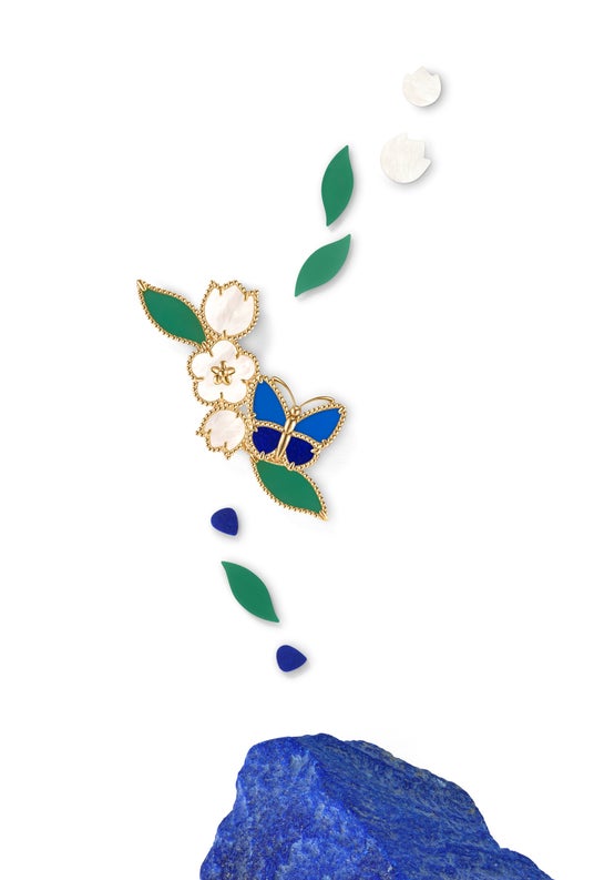 ラッキー スプリング コレクションを象徴するモチーフとして、これまで、プラムやスズランの花、繊細な葉とともに、てんとう虫が登場しています。今年、このアンサンブルにパピヨンが加わります。パピヨン(蝶)は、1906年以来、メゾンの伝統のひとつとして受け継がれてきたモチーフです。ブルーアゲートとラピスラズリという目にも鮮やかな素材を用いることで、生命力に満ち溢れる自然の概念を表現すると同時に、ヴァン クリーフ&アーペルのオーナメンタルストーンに対する揺るぎない審美眼を示しています。さらにメゾンのシグネチャーであるゴールドビーズによる二連の縁取りが、ストーンの色彩を一層際立たせます。