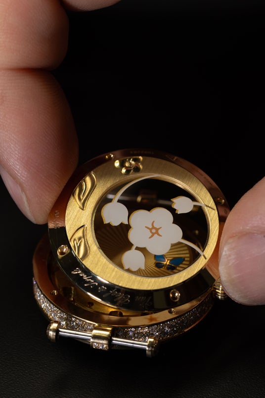 このウォッチをさらに際立てているのが、様々な箇所にセットされたダイヤモンドです。卓越性を追求するメゾンの伝統に則り、カラーはDEF、クラリティはIF~VVSという最も厳格な基準に適うダイヤモンドのみを使用し、ベゼル、分表示、セントラルアタッチメント、リューズ、ストラップのバックルに輝きを与えています。文字盤に綴られた物語は、ケースバックへと続きます。ゴールドのパーツには、繊細な葉がエングレービングで表現され、サファイアガラスには、フローラルモチーフがエナメル デカールで描かれています。