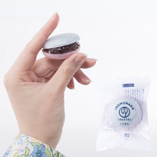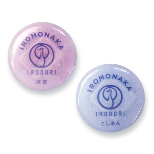 マカロンみたいなひとくち最中「IROMONAKA」を、つるんとかわいい缶バッジにデザインしました。バッグやキャップに飾ってお楽しみください。(ピンク、ブルーの2色いずれか1点。色はお任せください)