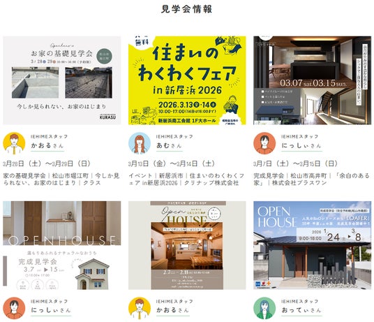 IEHIMEに参画参画する愛媛県内の工務店・ハウスメーカーの見学会情報を随時掲載。複数社の情報を一括で確認できます。