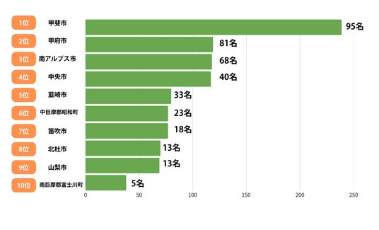 調査要約:・全体傾向では甲斐市(95件)が最多、次いで甲府市(81件)、南アルプス市(68件)となりました。上位3市で全体の約6割(62%)を占めており、山梨県内における居住ニーズは、生活・通勤の利便性が高い中心エリアに集中する傾向が見られます。