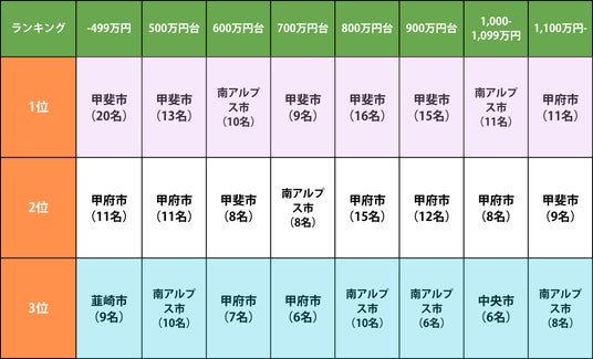 年収1,000万円以上の層では、甲府市と南アルプス市が同率で最多(各11件)となりました。高所得世帯の需要は、都市機能が集積する「甲府市」と、住環境を重視する「南アルプス市」で支持が二分される傾向にあります。