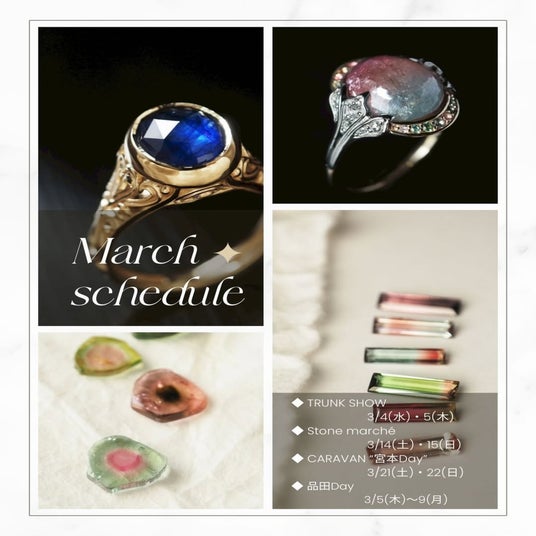 イベントでは、3月4日(水)・5日(木)に「誕生石」を主題としたTRUNK SHOW、3月14日(土)・15日(日)に約100石のルースが揃うSTONE marche、3月21日(土)・22日(日)には創業メンバーが来店するCaravanを開催いたします。