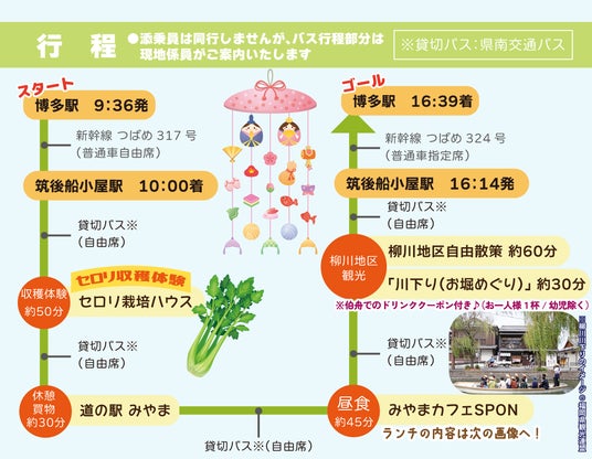 (1)ツアー名称:みやま市セロリ収穫体験&柳川川下りと雛祭りさげもんめぐり(2)出発日:2026年3月21日(土) 日帰り