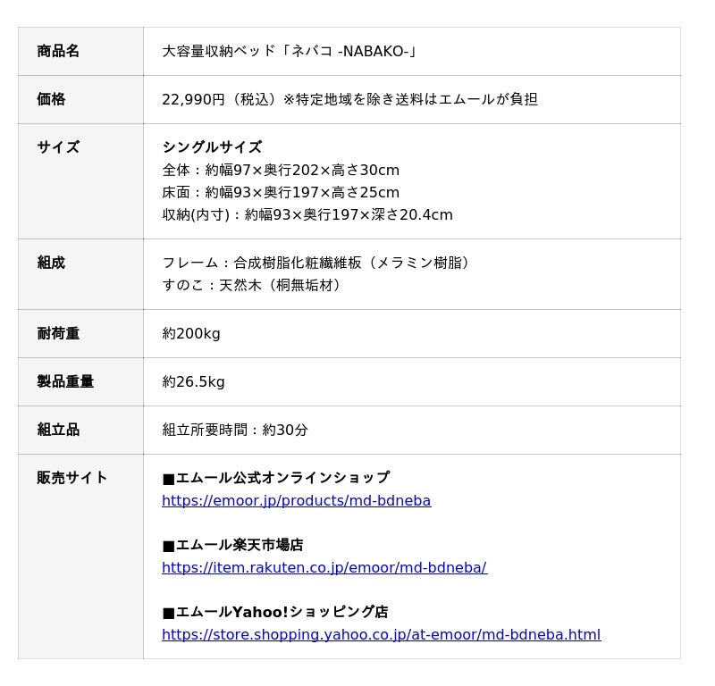 「身体に合った寝る・座る・たたむ」を提供する健康家具ブランドEMOORを展開する株式会社エムール(東京都立川市:代表取締役 高橋 幸司/以下、エムール)は、2026年3月3日より『大容量収納ベッド「ネバコ -NABAKO-」(以下、ネバコ)』の販売を開始しました。