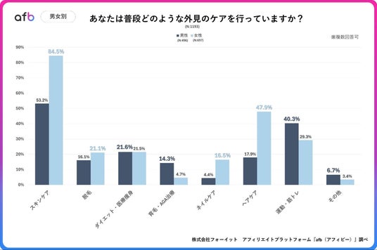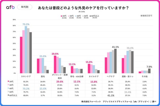アフィリエイトプラットフォーム「afb(アフィビー)」< https://www.afi-b.com/ >の開発運用をおこなう株式会社フォーイットは、全国の20代~60代までの男女1,193人を対象に身だしなみに関するアンケートを実施し、年代別等の特徴についてまとめました。