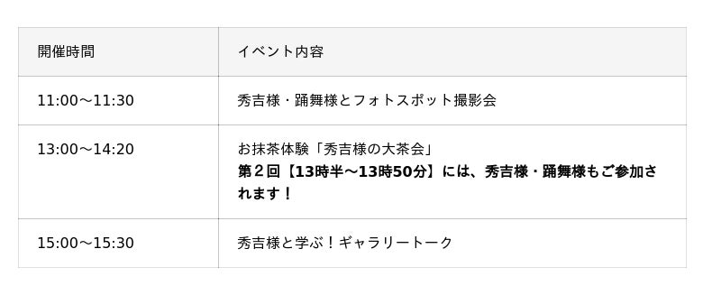 第2回【13時半~13時50分】の時間帯は、秀吉様と踊舞様もご参加予定。受付は当日会場にて先着順となりますので、お早めにお越しください。