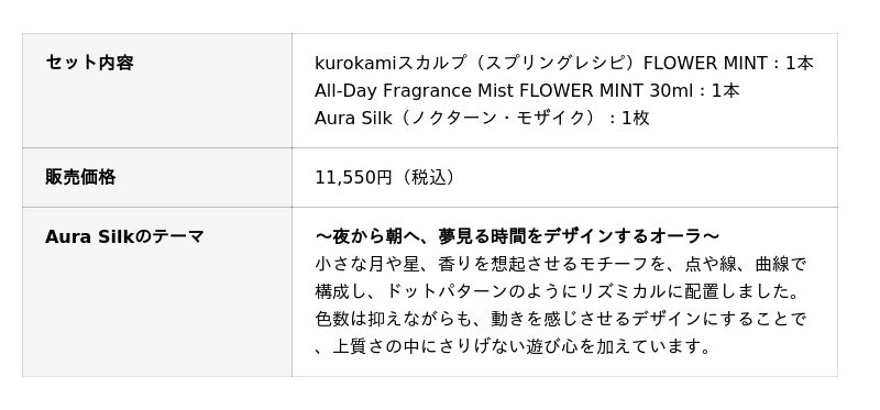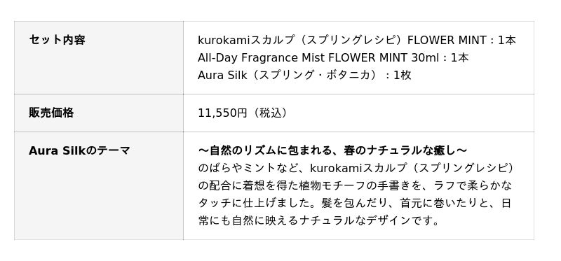 本ボックスは、同日新発売の限定シャンプー「kurokamiスカルプ(スプリングレシピ)」と、同じ香りのフレグランスミスト、さらに日本で初めてオーダーメイド枕を開発した眠りの専門店 my makura とのコラボレーションによるシルク枕カバーを組み合わせ、「眠るたび、美しく。昼も、夜も、美しく。」をテーマにお届けします。ご自身へのご褒美としてはもちろん、春のギフトとしてもお選びいただけるセットです。