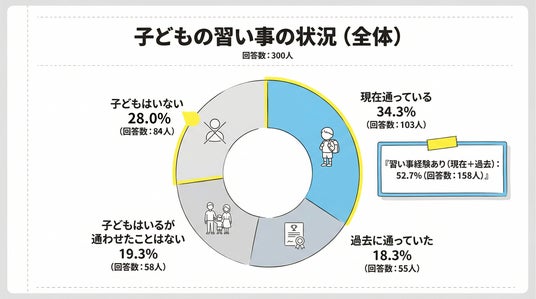 回答者300人のうち、子どもの習い事について現在通っている人は34.3%(103人)、過去に通っていた人は18.3%(55人)で、合計52.7%(158人)が習い事経験ありでした。