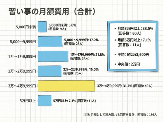 月額3万円以上は38.5%(60人)、月額5万円以上も7.1%(11人)あり、一定数は習い事が家計の固定費になっている状況がうかがえます。