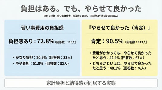一方で、やらせたことへの評価は良かったが90.5%(143人)と高く、家計負担と満足感が同居する実態が見えてきました。