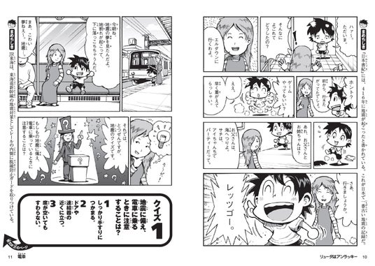アンラッキーな主人公、リュータ。ショッピングモールにいたとき、大きな地震が彼をおそいます。リュータは避難のときもアンラッキーなことばかり……。はたして家族4人は、無事に生きて集まれるのでしょうか? ショッピングモールや友達の家、海など、いろいろなシチュエーションでの対応を、まんがとクイズを通して解説しています。まんが家ユータ氏が描くユーモアたっぷりのまんがは、お子さまも楽しく読み進めることができます。危機管理教育研究所代表の国崎信江氏が監修し、コラムや豆知識も充実。命を守るための知識が学べます。