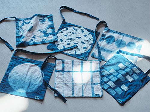 今回の出店では、親子のためのテキスタイルブランド“すくすくすくも”を中心に、洋服や小物が店頭に揃います。染める回数や濃度によって、深く美しい青色から、淡い水色まで、多様な藍色で表現されたアイテムをぜひ店頭でご覧ください。