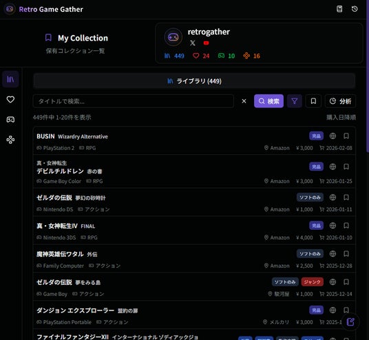 RGGは所有しているゲームの管理はもちろん、「プレイ中」「クリア済み」といった進捗ステータスの管理、さらにはウィッシュリストによる購入検討までをワンストップで行えるWebサービス(PWA)です。20,000件以上の国内ゲームデータベースを検索し、誰でもお手軽に自身のライブラリを作成することができます。