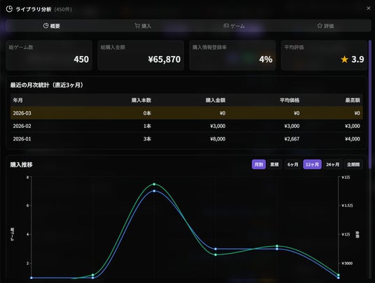 登録したマイライブラリを元に「購入」「ゲーム」「評価」といった観点毎に表やグラフで分析できるようになりました。