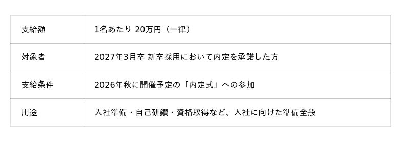 こうした人財育成への姿勢は、入社前の段階から変わりません。内定者一人ひとりが安心してチャレンジできる環境を入社前から整えることが、入社後の早期活躍と長期的な成長につながると考え、このたび「入社前チャレンジ支援金」制度の導入を決定いたしました。