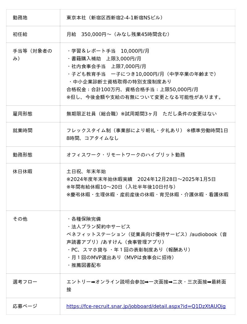 「入社前チャレンジ支援金」 以外にも安心して入社準備ができる「内定者フォロープログラム」の充実や入社後コンサルタントとして成長できる環境づくり・人財育成に力をいれています。加えて2025年12月より就活生のチャレンジを応援する性格・適職診断ツール「FCE式キャリンク診断」提供開始し、心理学と統計学を組み合わせた「自己診断」×「他己診断」で多角的な自己分析を支援しています。