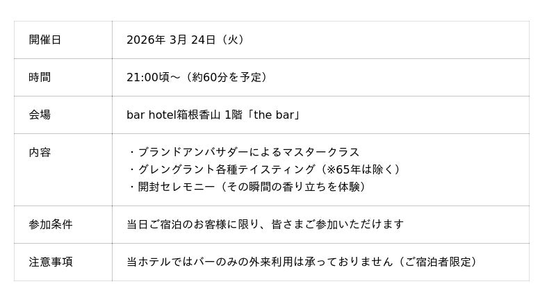 シマダハウス株式会社(東京都渋谷区、代表:島田一成)が運営する bar hotel箱根香山(神奈川県足柄下郡箱根町小涌谷)では、当館に入荷した世界限定151本の希少シングルモルトウイスキー「グレングラント 65年(The Glen Grant 65 Year Old)」の開封式を、2026年3月24日(火)に開催いたします。
