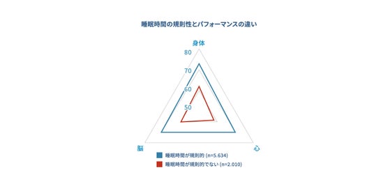 睡眠時間の規則性とパフォーマンス指標(身体・心・脳)を比較したところ、規則的な群は不規則な群に比べて、身体・心・脳のスコアがいずれも高いことが示されました。さらに、睡眠時間別に比較したところ「7~8時間」の睡眠を「規則的」に確保している層が、すべての項目において最も高いスコアを示しました。睡眠が不規則な層や、規則的であって睡眠時間が極端に短い/極端に長い層では、パフォーマンスが低い傾向がみられました。