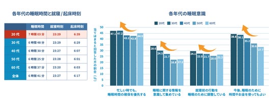 20代は、唯一平均睡眠時間が7時間を超える世代となり、睡眠を自己管理の重要な資源と捉える意識の高さも顕著に表れています。本調査で睡眠に対する意識や行動においては、「忙しくても睡眠時間の確保を優先する」「睡眠に関する情報を積極的に収集している」「睡眠のための支出や工夫を行っている」「就寝前の行動を睡眠のために調整している」「今後も睡眠のために時間やお金を投資してよい」の全項目で、20代が全世代において最も高い水準を示すといった”睡眠優等生”のポテンシャルを持っています。