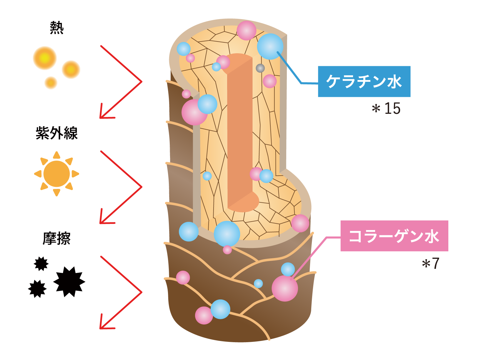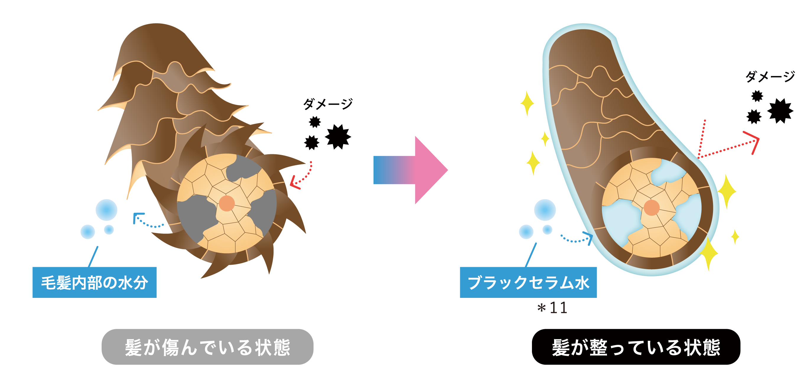 既存ラインの10倍濃度で配合※6された「コラーゲン水*7」と「ケラチン水*15」が髪を包み込み、美容液成分*1~10を毛髪内部に閉じ込めます。