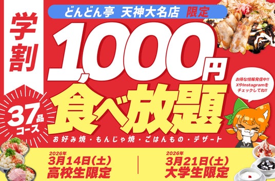 九州を中心に展開するお好み焼専門店「どんどん亭」は、2月に開催した高校生応援1,000円食べ放題イベントが大好評だったため、3月14日は高校生限定・3月21日は大学生限定の計2回「どんどん亭」 天神大名店にて「1,000円食べ放題イベント」を開催します。