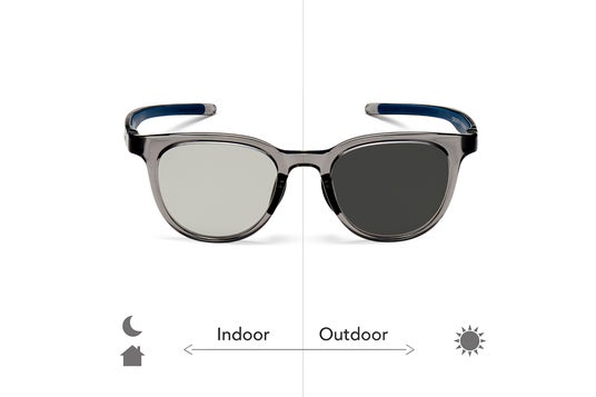 屋内ではクリアに近い色合い、屋外では眩しさを抑えるサングラスとして機能し、かけ替えの手間なく快適な視界を保ちます。