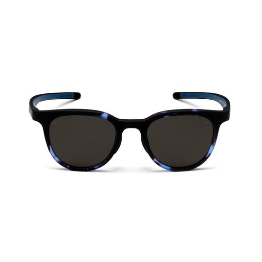 職人の手塗りで仕上げたマットブルーデミ(べっ甲柄)フレームには、反射光を抑え視界をクリアに保つ、ブラックの〈偏光レンズ〉を採用。