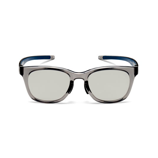 クリアなグレーフレームには、紫外線量に応じて濃度が変化するグレーの〈調光レンズ〉を選定。屋内外を行き来する場面でも快適な視界を保ちます。
