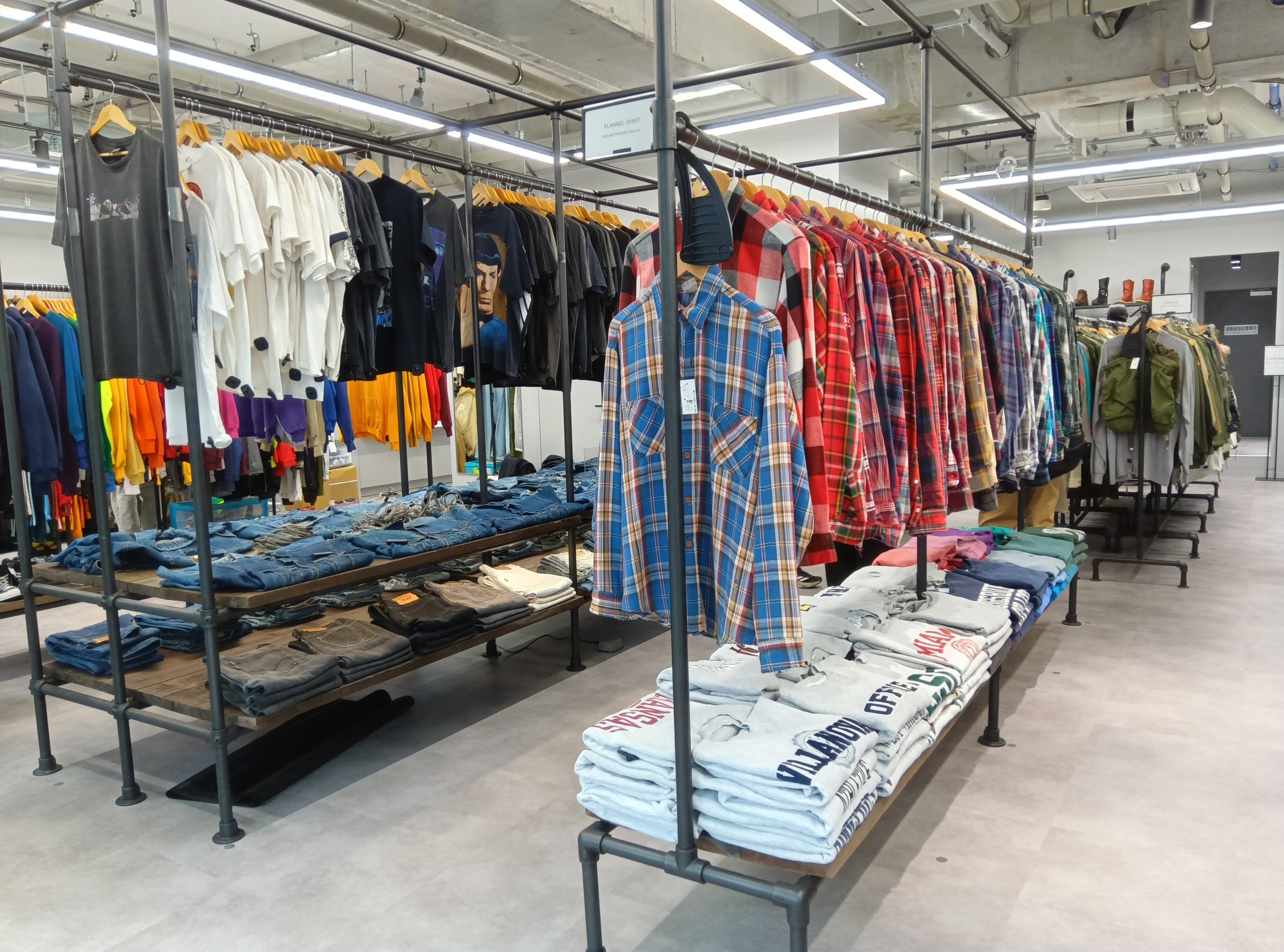 店内はモノトーンを基調とし、床や壁を無機質な質感で統一しています。売場中央には、古材を使用した棚板とパイプ管で構成された大型ラック什器を配置。通常のセカンドストリートとは一線を画した売場に、コンセプトに沿った各スタイルのアイテムを区画ごとに陳列しています。
