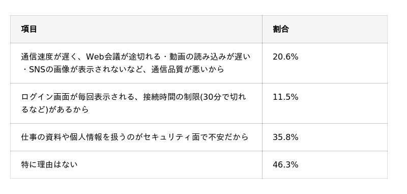 特に「通信速度が遅い」(40.1%)が最多であり、Web会議や動画視聴など一定の通信品質を求める利用シーンにおいては、満足度が十分とは言い難い状況がうかがえます。