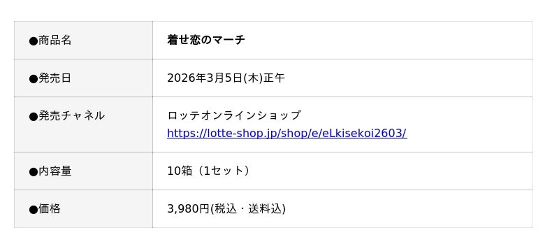 株式会社ロッテ(東京都新宿区、代表取締役社長執行役員:中島英樹)は3月5日(木)正午に、ロッテオンラインショップ限定で「オリジナルコアラのマーチ」シリーズから、「着せ恋のマーチ」を販売します。TVアニメ「その着せ替え人形は恋をする」Season 2が、大人気チョコ菓子のコアラのマーチに大変身し、10種類セットで発売します。ロッテオンラインショップにて、期間限定販売となります。ぜひ詳細をご覧ください!