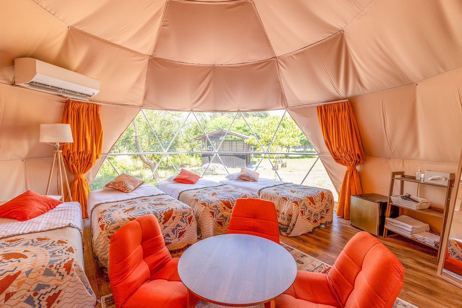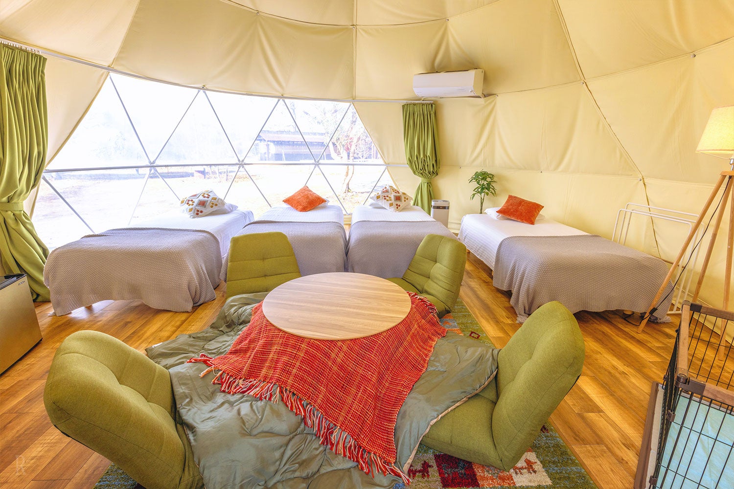 1~15名まで対応する大・中サイズのコテージに加え、メタセコイア並木の四季をコンセプトにデザインされたドーム型グランピング(最大5名)もラインナップ。人数や用途に応じて最適な一棟を選べるほか、最大45名までのグループ貸切にも対応しており、少人数のプライベート滞在からファミリー・グループ・企業利用まで、幅広いシーンに寄り添う柔軟な滞在スタイルを実現します。