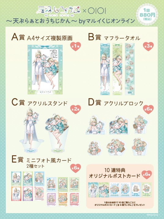 A賞A4サイズ複製原画、B賞マフラータオル、C賞アクリルスタンド、D賞アクリルブロック、E賞ミニフォト風カード 2種セットのほか、10連特典としてポストカードをご用意しています。