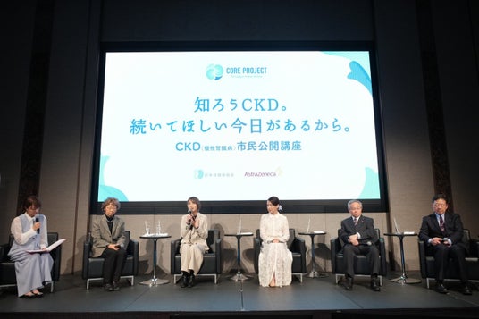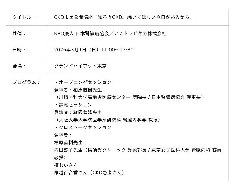 NPO法人日本腎臓病協会(所在地:東京都文京区、理事長:柏原 直樹、以下、日本腎臓病協会)とアストラゼネカ株式会社(本社:大阪市北区、代表取締役社長:堀井 貴史、以下、アストラゼネカ)は、CKD(慢性腎臓病)に関する市民公開講座「知ろう CKD。続いてほしい今日があるから。」を、2026年3月1日(日)に都内で開催しました。本講座では、3月12日の世界腎臓デーを前に、国民病とされるCKDの正しい知識と、良質な治療の普及を目指す新たな取り組み「CORE PROJECT」の概要を初公開し、多くの参加者と共にCKDへの理解を深めました。