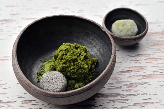 抹茶の澄んだ香りをまとったホワイトチョコレートとよもぎ団子