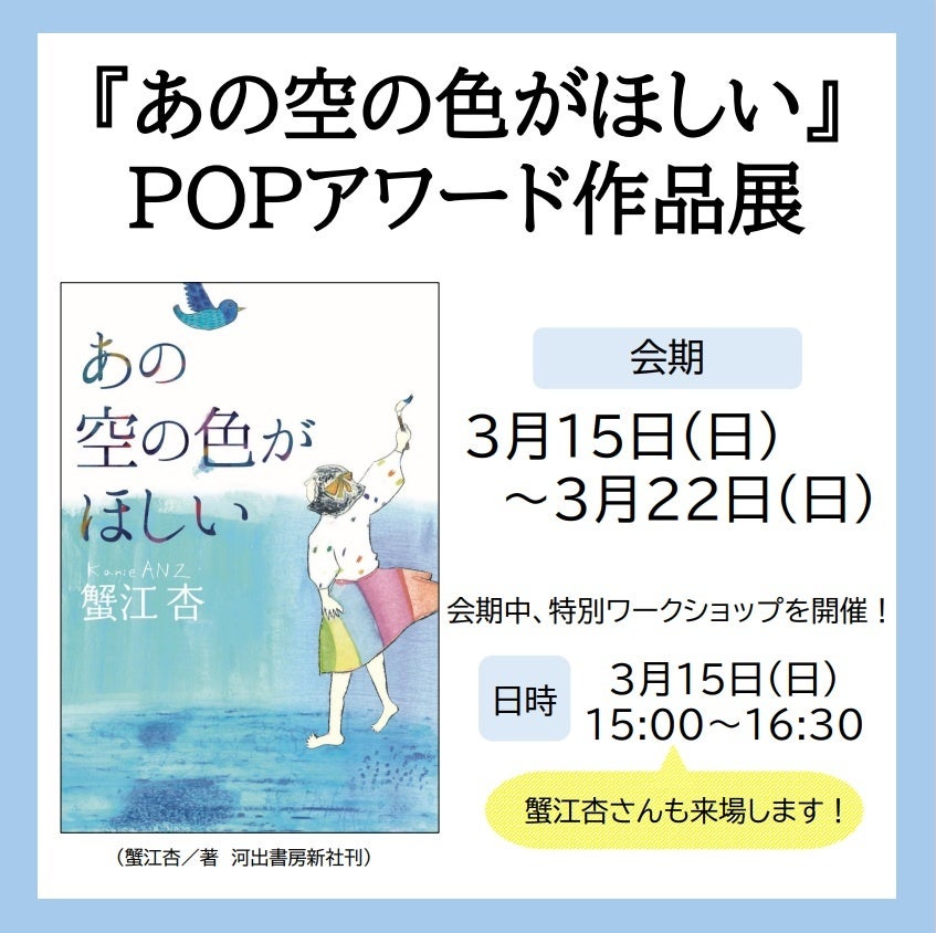 当アワードでは、プロジェクトの一環として、日野市出身の画家・作家の蟹江杏さんと日野市立図書館、未来屋書店多摩平の森店が連携し、第74回小学館児童出版文化賞受賞作『あの空の色がほしい』を題材としたPOPを募集しました。全国より、全45点の素晴らしい作品をご応募いただきました。その中から、7作品に下記の賞を授与いたします。