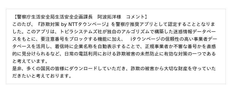 NTTタウンページとトビラシステムズ株式会社(本社:愛知県名古屋市、代表取締役社長:明田 篤、以下「トビラシステムズ」)は、「特殊詐欺対策アプリに係る警察庁推奨制度」に本アプリを共同申請し、詐欺対策に関する機能や運用体制が評価され、「警察庁推奨」の認定を受けることとなりました。