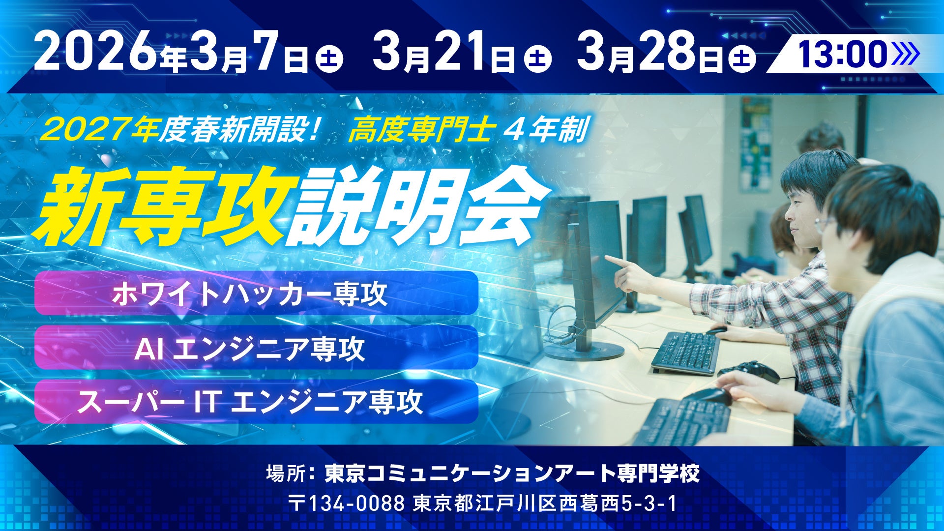 東京コミュニケーションアート専門学校(以下「TCA」/東京都江戸川区)は、新専攻「AI&セキュリティワールド(以下「本専攻」)」を2027年度より開設することをお知らせします。本専攻はAIやセキュリティをはじめとするIT領域を担う次世代の人材育成のため、関係企業・自治体と共にカリキュラムや授業課題を策定する「産学連携教育」を基盤とします。本専攻は「ホワイトハッカー専攻」「AIエンジニア専攻」「スーパーITエンジニア専攻」の3つのコースからなり、掲げるそれぞれの領域において即戦力として活躍する人材育成を目指し四年制(高度専門士)の教育を提供します。