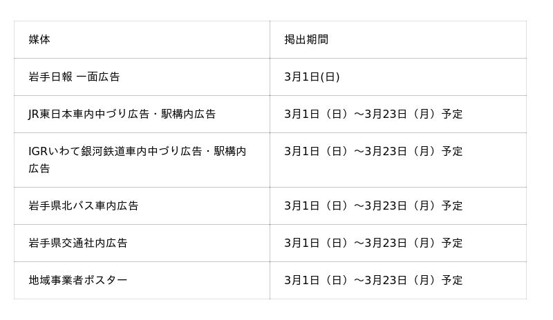 1. メディア・交通広告による卒業応援メッセージ発信盛岡駅構内や電車・バス車内などに共通ビジュアル・共通コピーのメッセージを掲出。交通機関や地域拠点に幅広く卒業生の門出を祝うメッセージがあることで、街全体に一体感を生み出します。