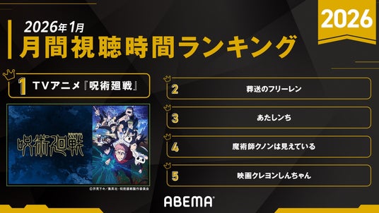 新しい未来のテレビ「ABEMA」は、2026年1月のアニメジャンル(※)の総視聴時間が2025年1月の記録を超え伸長したことをお知らせいたします。合わせて、中でも特に視聴時間を牽引した上位5作品を「月間視聴時間ランキング」として発表いたします。