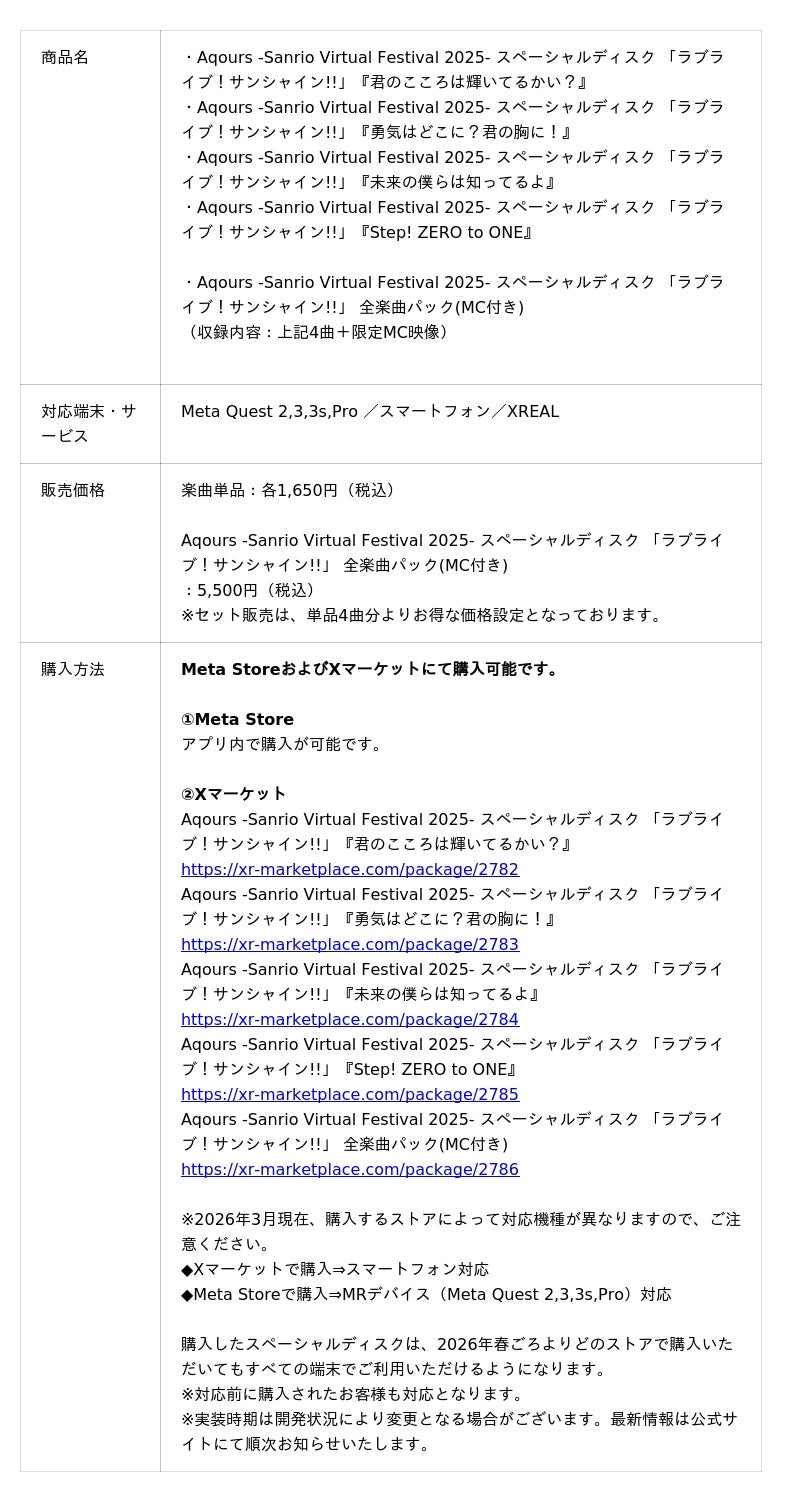 株式会社Gugenka(代表取締役CEO 三上昌史)は、3D空間映像プラットフォーム「スペーシャルディスク」において、『ラブライブ!サンシャイン!!』に登場するスクールアイドルグループ Aqours のスペーシャルディスクを 2026年3月4日(水)18:00より販売開始いたしました。