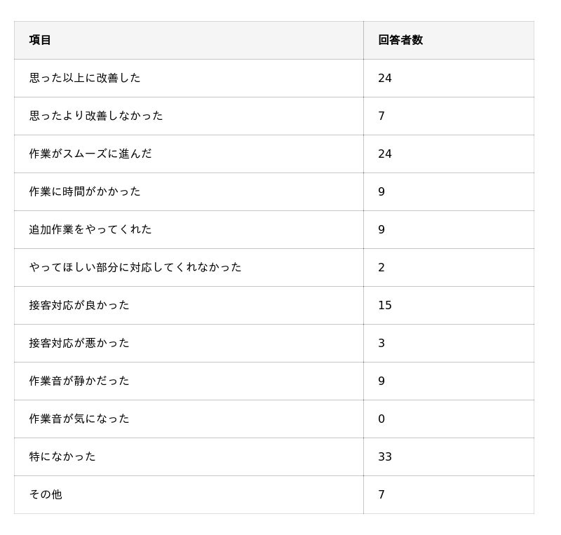 - 主な想定外の出来事としては「思った以上に改善した」「作業がスムーズに進んだ」「接客対応が良かった」ことが挙げられた。