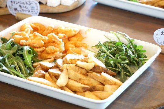 海老フリット&ポテトフライサクサクの衣が軽やかで食べやすく手に取りやすい、ワインにも合う人気メニュー。