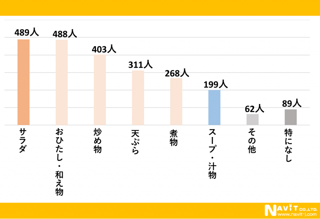 「春野菜を使った料理で、よく食べるものはどれですか?」という質問を複数選択可で行ったところ、「サラダ」が489人、「おひたし・和え物」が488人、「炒め物」が403人と続きました。素材の味を味わえるサラダが人気のようですね。